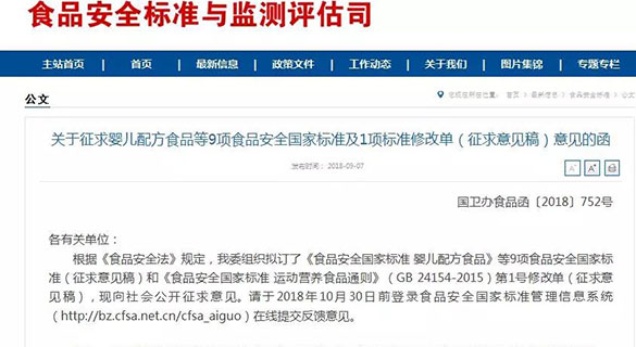 9月7日,食品安全標(biāo)準(zhǔn)與監(jiān)測(cè)評(píng)估司發(fā)布了《關(guān)于征求嬰兒配方食品等9項(xiàng)食品安全國家標(biāo)準(zhǔn)及1項(xiàng)標(biāo)準(zhǔn)修改單(征求意見稿)的函》,其中包括嬰兒配方食品、老年食品通則、運(yùn)動(dòng)營養(yǎng)食品通則等在內(nèi)的9項(xiàng)食品安全標(biāo)準(zhǔn)開始征求意見。