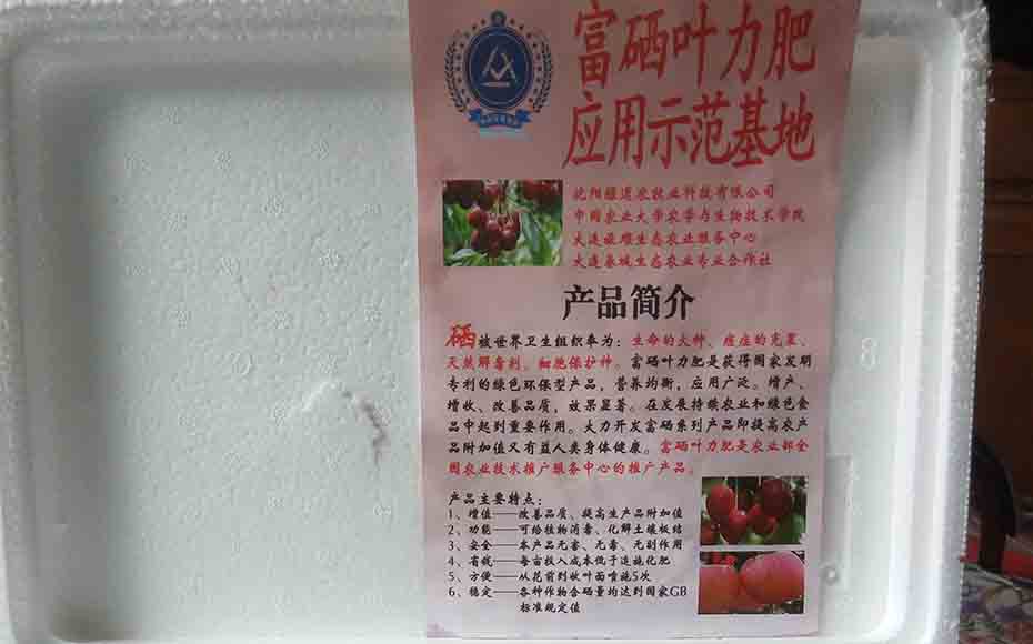 2011年大連市旅順口富硒大櫻桃使用基地。所種植的蔬菜完全使用本公司自主研發(fā)的發(fā)明專利產(chǎn)品富硒有機(jī)肥,經(jīng)國家農(nóng)業(yè)部檢測所有產(chǎn)品均無農(nóng)藥殘留,而且還含有人體所必須的各種微量元素(如:硒、鋅、銅、鐵、鈣、鎂等元素),本基地種植的所有富硒蔬菜經(jīng)過化驗(yàn)都能達(dá)到國家標(biāo)準(zhǔn)規(guī)定值,達(dá)到出口標(biāo)準(zhǔn)。實(shí)現(xiàn)了硒的天然有機(jī)化。